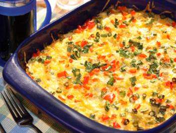Combine all ingredients. Mix well. Pour into a greased 7 x 11 inch baking dish. Bake at 375 degrees for 30 minutes or until set.