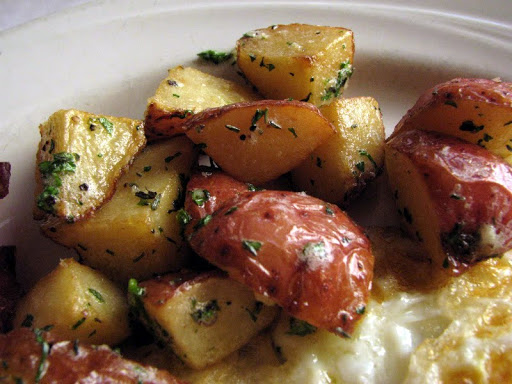 Remove potatoes with a slotted spoon to servbing bowl. Add pepper to skillet, stir. Pour sauce over potatoes. Sprinkle with remaining parsley.