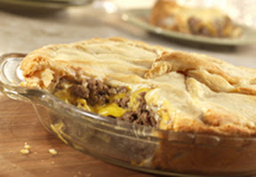 Unroll 1 package crescent roll dough and press on the bottom and up the sides of a 9-inch pie plate. Press the seams to seal. Layer half the beef mixture and half the cheese in the pie plate. Repeat the layers. Unroll the remaining dough. Place the dough over the filling and press the edges to seal, if desired.
