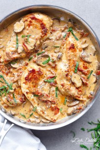 A Creamy Sun Dried Tomato Parmesan Chicken with Mushrooms that is Gluten Free and made with NO HEAVY CREAM.....or ANY cream.....at ALL!