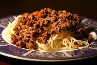 Real Bolognese sauce requires hours of simmering. But this quick version will do in a pinch. Recipe found in the Sacramento Bee (they picked it up from the Chicago Tribune). A good, everyday recipe