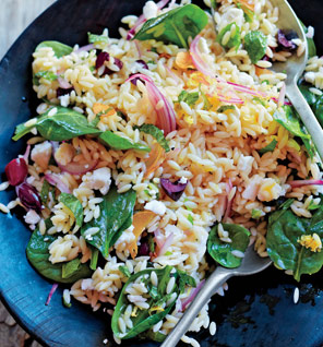 In a small pan, warm oil over medium-low heat. Sauté garlic until lightly golden, 1 to 2 minutes. Transfer garlic and whatever oil remains in the pan to a bowl. Add 3 tbsp juice, 2 tsp zest, salt and pepper; whisk to combine. Add spinach and toss lightly. Add orzo, olives, cheese, onion and mint. Toss to combine; serve.