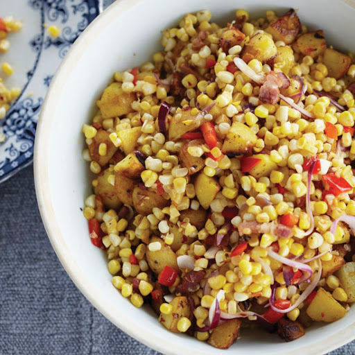 Pour off all but 3 tablespoons of the bacon fat in the skillet. Add the potatoes and cook over moderate heat until they start to brown, about 3 minutes. Stir and cook for about 2 minutes longer, until almost tender. Add the diced red peppers and cook, stirring occasionally, until the potatoes and peppers are tender, about 5 minutes. Add the corn kernels and cook, stirring, until heated through, about 3 minutes.