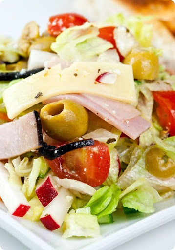 Toss together all salad ingredients in a bowl, except Romano Cheese.