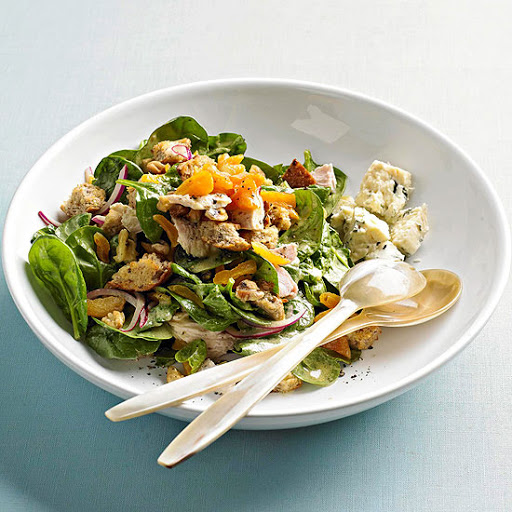 2. Meanwhile, in a large salad bowl toss together spinach, turkey, dried apricots, cranberries (if desired) and red onion; set aside.