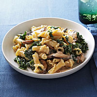 3. Meanwhile, in drained pot, melt remaining 3 tbsp butter over medium heat. Add flour; cook 2 minutes. Pour in milk in a thin stream, whisking constantly. Bring to a simmer and cook 7 minutes, until thickened, whisking occasionally. Stir in salt, pepper and nutmeg. Stir mushroom-kale mixture and pasta into sauce and serve.