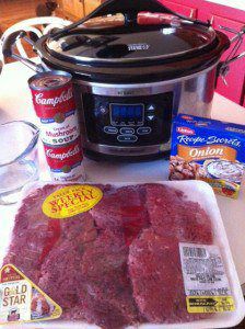 Place all ingredients in a crock pot. Cook on low all day. Serve over rice, noodles, mashed potatoes or with your favorite side dishes