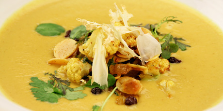 Curry Cauliflower Soup, Currants, Dried Apricots and Toasted Almonds
