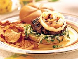 2.Place patties on grill over medium heat. Cover grill; cook 12 to 15 minutes, turning once, until meat thermometer inserted in center of patties reads 160ºF. Add onion slices to grill for last 8 to 10 minutes of cooking, brushing with 2 tablespoons of the dressing and turning once, until crisp-tender.