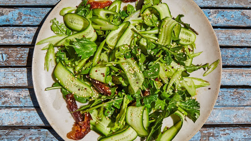 Trim ends from cucumbers and very thinly slice lengthwise on a mandoline or with a vegetable peeler or sharp knife into long ribbons. Toss cucumbers, arugula, celery, celery leaves, and dates in a large bowl to combine.