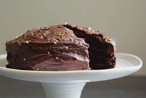 When the cakes are chilled, make the frosting by melting together the dark and milk chocolate in a bowl over a pan of simmering water. When the chocolate has melted, take it off the heat and beat in the sour cream and salt until smooth. Allow the frosting to cool until room temperature before trying to frost the cake.