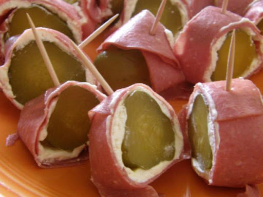 3. Take 2-3 pieces of meat (depending on size of pickle), and place them on a cutting board overlapping half of each with the next.