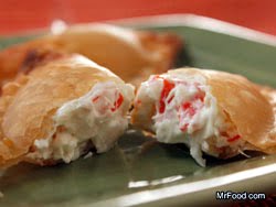 Place 1 teaspoon crab mixture in center of each wonton. Brush edges lightly with water then fold in half (one point to an opposite point, like a turnover) over crab mixture, and press to seal. Place on baking sheet.