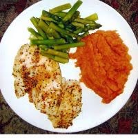 Spray baking pan with oil or wipe pan with olive oil. Place filet in pan and sprinkle on the lemon juice and then the Mrs. Dash grilling blend. Bake in a 375-degree oven for 12-13 minutes. Serve with mashed sweet potatoes and a vegetable or salad.