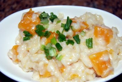 Turn off the heat on the risotto, as well as the broth if there is any remaining in the pan. Gently stir in the butternut squash, Parmesan, the remaining tablespoon of butter, and salt. Transfer the risotto to a serving bowl and sprinkle with chives. Serve immediately.