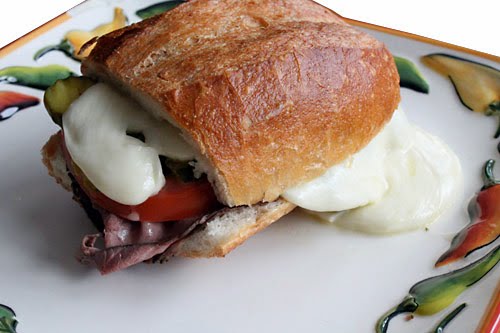 During this time, slice your bread in half, lengthwise, and tear out the interior bread, just leaving a the crusty bread, and a bit of the interior as your vessel. Add the slices of roast beef, top with the sliced tomato, sprinkle with the salt and oregano, then top with the pickles. Take a fork and grab that gooey melted cheese from the saucepan, and blanket the top of the sandwich. Quickly place the top of the bread onto the sandwich, and push down just a bit, making sure the cheese comes out, wrapping the sandwich with love.