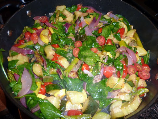 Saute onion in olive oil until it begins to get translucent. Add minced garlic and saute for another minute. Add yellow squash, zucchini, and asparagas (or other favorite veggies). Add salt and pepper to taste, 1 T. cinnamon, and 1 T. Veggie Bombay (or All Spice). Saute for about 15 minutes or until veggies start to soften. Add cherry tomatoes and spinach. Cover with a lid and allow to cook about 5 more minutes. Stir to mix.