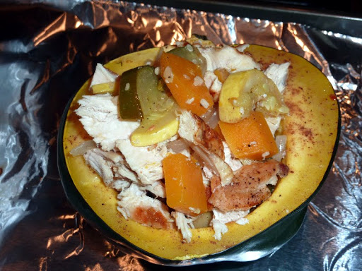 Cut up chicken breasts and add to squash mixture. Fill each acorn squash half and serve.