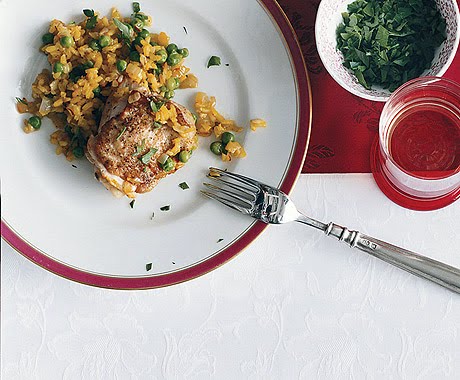 Pour off all but 2 tablespoon fat from skillet. Cook onion and garlic with 1/4 teaspoon each of salt and pepper over medium heat, stirring, until golden, about 6 minutes. Add rice and cook, stirring, 1 minute. Add broth, water, saffron, and bay leaf and bring to a full boil. Nestle chicken in rice, keeping as much rice around (rather than under) chicken as possible, and add juices from plate. Simmer, covered tightly with lid, over low heat until chicken is cooked through, rice is tender, and most of liquid is absorbed, about 25 minutes. Remove from heat and stir in peas. Cover with a kitchen towel and then lid and let stand until all of liquid is absorbed, about 15 minutes. Discard bay leaf.
