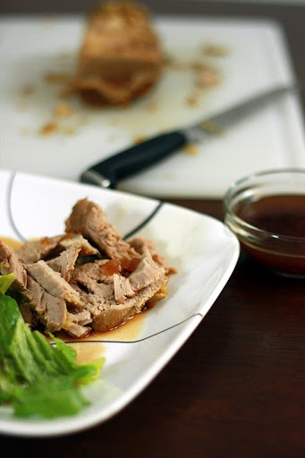 Cut the tenderloin in half crosswise. Place the pork and the dry soup mix into a slow cooker. In a small bowl, combine water, wine, and soy sauce. Pour mixture over the pork, turning to coat. Spread garlic over the pork, leaving as much on top of the roast during cooking as possible. Sprinkle with pepper. Cover slow cooker and cook on low setting for 3 hours. Serve with cooking liquid on the side as au jus.