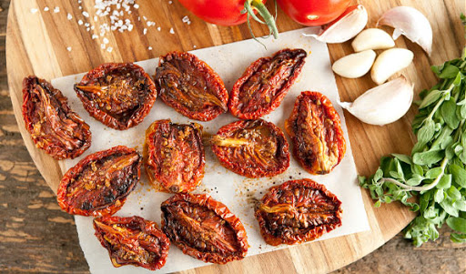 Dry tomatoes in oven for 8 to 12 hours. The tomatoes should be dried but pliable and chewy like a raisin.