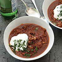 Serve the chili in bowls. Top with the sour cream and parsley.