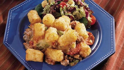 Spoon beef mixture into sprayed baking dish. Spoon pizza sauce evenly over top. Arrange pepperoni and bell pepper over sauce. Sprinkle with cheese. Arrange potato nuggets over cheese. Cover with foil.