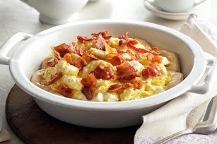 Try with some breakfast gravy. Maybe sausage instead of bacon. Green and/or Red Peppers with the eggs as well... maybe corn too.