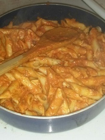 Saute onion (chopped small) in butter and olive oil until translucent. Add can of tomatoes and cook for 45 minutes on low heat. Stir so that sauce does not stick to pan. Add heavy cream and cook for an additional 20 minutes. Add vodka and cook for 5 - 10 minutes.