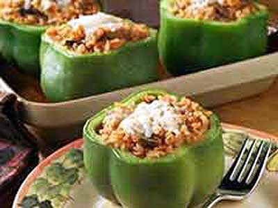 Stuff Peppers with meat and rice mixture. Put the top of the pepper back on and cook at 350 degrees for 35 min or until well baked on top.