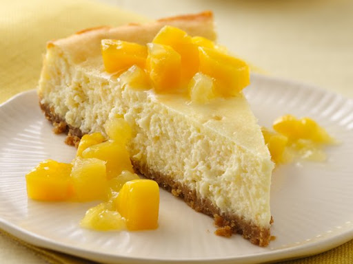 In large bowl, toss glaze with pineapple and mango. Spoon onto top of cheesecake. Garnish with mint leaves.