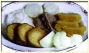 Ponga a cocer la carne junto al perejil, cebolla, tomate y sal. Luego de 30 min. Añada zanahoria, repollo, zapallo, cuando todo este suave , cuele el caldo. Aparte ponga a cocer papas , camote y peras por separado. Sirva las carnes, verduras y frutas en una fuente y el caldo aparte.
