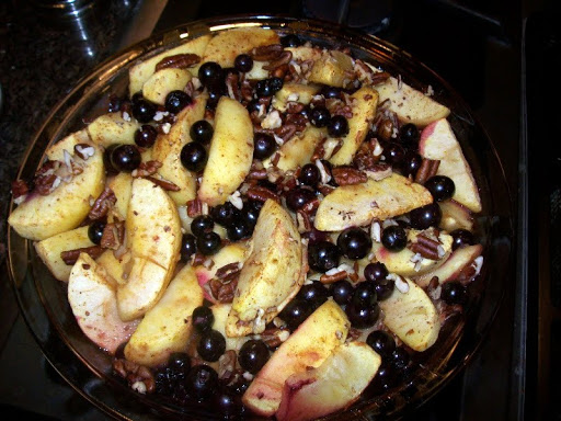 Combine fruit, juice and zest of orange, lemon juice, pumpkin pie spice, and nuts. Place in a 9” pie plate and pour orange juice over the fruit. Bake at 350ºF for 40 minutes or until apples are softened but still firm.