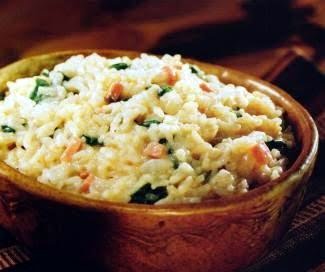 Over medium-high heat add hot water and broth slowly as it is absorbed by rice, then add salt and nutmeg. Stirring occasionally. Stir in Cheddar and ham, then spinach.