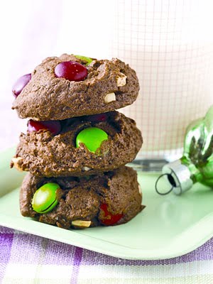 - 1 cup red and green candy-coated chocolate pieces (such as M&Ms)