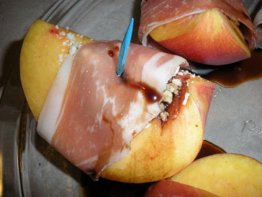 1 quarter the peaches and remove the pit. 2 place one ounce of blue cheese in each pit side crescent. 3 wrap the blue cheese stuffed peaches with one slice of proscuitto ham. 4 place two on a dish and lightly splash aged balsamic vinegar over the top. 5 HINT *dissolve sugar to taste into regular balsamic vinegar for a less costly rendition of aged balsamic*.