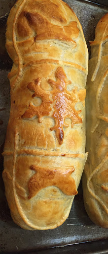 Preheat oven to 425 degrees. Place roast on greased baking sheet. Cover meat with pate and then duxelles. Roll out puff pastry and cover meat, sealing edges with egg whites. Cut remaining puff pastry with cookie and pastry cutters to decorate roast. Put cut outs onto roast with egg white. Brush roast with French egg wash.
