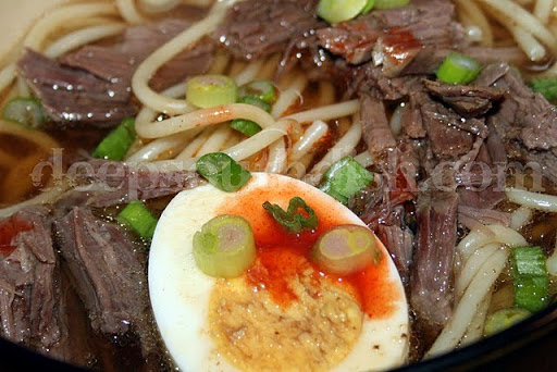 To assemble the soup, place a serving of spaghetti noodles in the bottom of a bowl. Use a slotted spoon to extract a serving of the shredded beef and add that on top of the noodles. Add a boiled egg, either whole, halved lengthwise or cut into chunks. Spoon about 1-1/2 cups of the beef broth on top and sprinkle with sliced green onion. Add a few dashes of soy sauce, hot sauce and Worcestershire sauce. Some folks also like to also add a bit of ketchup to theirs.