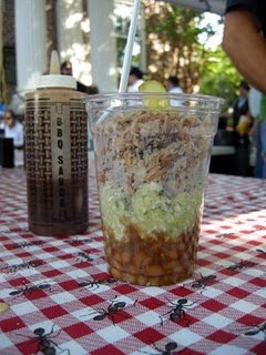 Baked beans layered with slaw (its a BBQ slaw, not a mayonaise slaw), topped with pulled pork and served with a pickle sticking out!