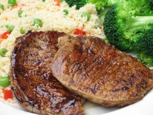 Sprinkle pork chops with salt, pepper, and thyme. Cook for 5 minutes on each side in olive oil. Remove and add vinager & broth to the pan. Scrape the brown bits from the pan. Boil until thick. Return to the pan to coat and finish cooking pork chops.