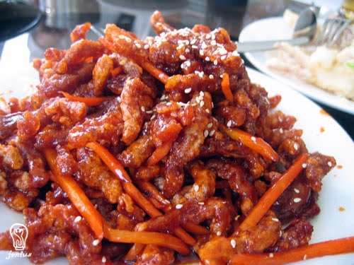 Reheat reserved oil over high heat until very hot and stir fry onion, garlic, and chilies for a few seconds. Add sugar, vinegar, and soy and stir to combine. Once combined, add beef and carrots. Stir well and serve with rice.