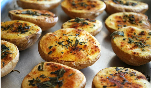 Cut the potatoes in half lengthwise and place side up on a baking sheet.
