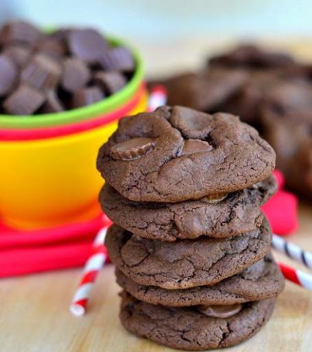 Flatten each cookie slightly and add 1-2 Reese's minis to the top of each cookie.