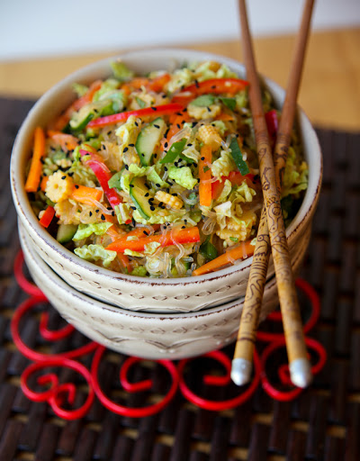 Soak the bean threads in warm water to cover for 10 minutes or till pliable. Drain, then cook in boiling water till the noodles expand and appear glasslike, 1-2 minutes. Drain, rinse with cold water and drain again. Cut into 4-inch lengths. Place in a large bowl along with the rest of the salad ingredients. In a small bowl whisk together the ingredients for the dressing till well combined; toss with the salad to evenly coat. Garnish with sesame seeds.