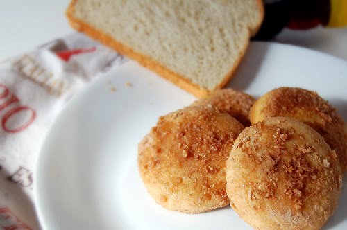 To make the topping, in a small bowl, stir together 1/4 cup sugar, bread crumbs, and cinnamon until well combined; sprinkle a generous amount of topping over each cookie.
