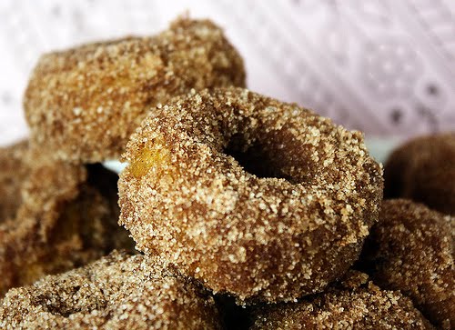Turn the donuts out of the pans and allow them to cool a bit. When cool enough to handle, dip them in the butter and roll them in the cinnamon sugar.