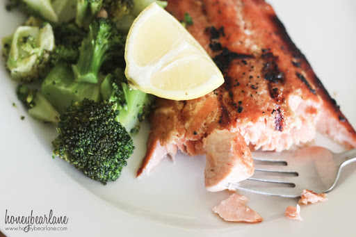 2.When you are ready to cook, heat up your grill. Then make a little dish out of aluminum foil with sides. Slide the fish on your ‘dish’ and add a little of the marinade on top. Put the fish skin side down. Then push the whole dish onto the grill. Close the lid and grill for about 20 minutes. After that is done, flip the salmon over onto the grill to sear the top, then you can scrape off the skin (it should lift right off.) Grill for 1-2 minutes and then serve.