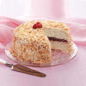 Prepare cake batter according to package directions; fold in 2/3 cup coconut. Pour into two greased and floured 9-in. round baking pans. Bake at 350° for 25-30 minutes or until a toothpick inserted near the center comes out clean. Cool for 10 minutes before removing from pans to wire racks to cool completely.