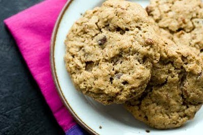 Mix together the flours, baking powder, baking soda, cinnamon and salt, and add to butter, sugar and egg mixture. Beat until well incorporated, and then stir in oats, chocolate chips and nuts.