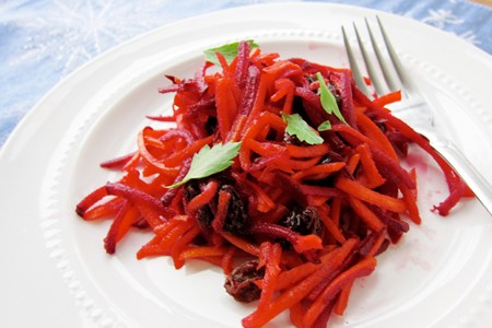 Peel and trim the carrots and beets, then coarsely grate both on a grater – wear rubber gloves if you don’t want pink hands!